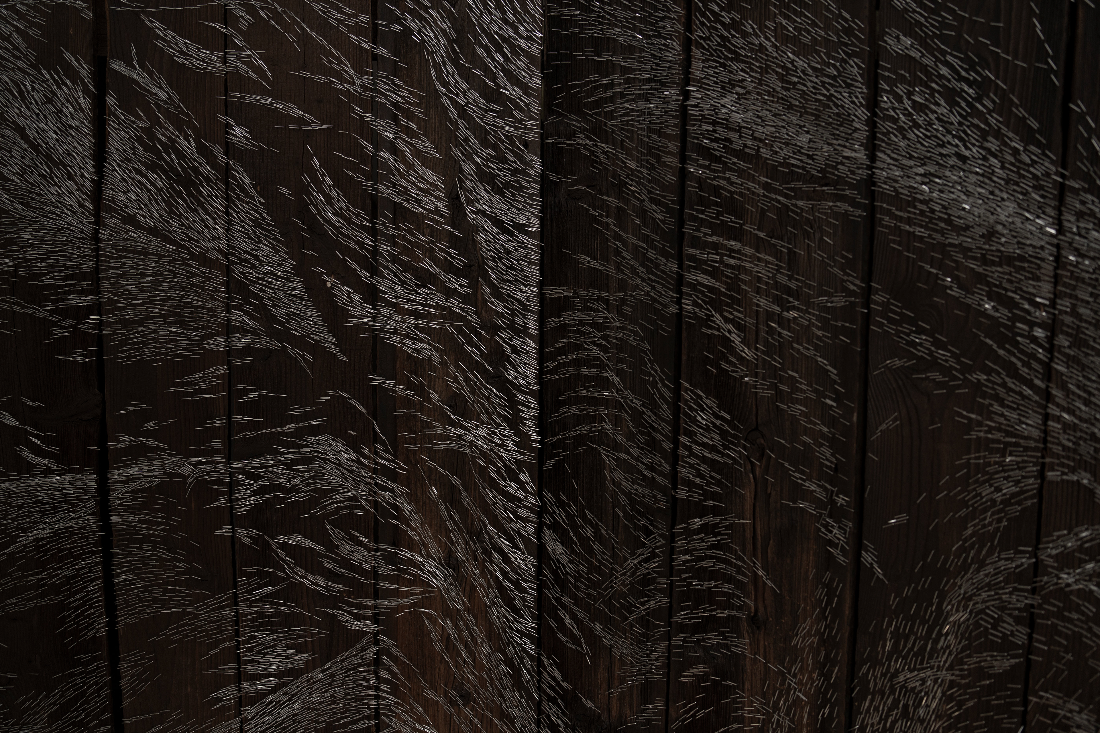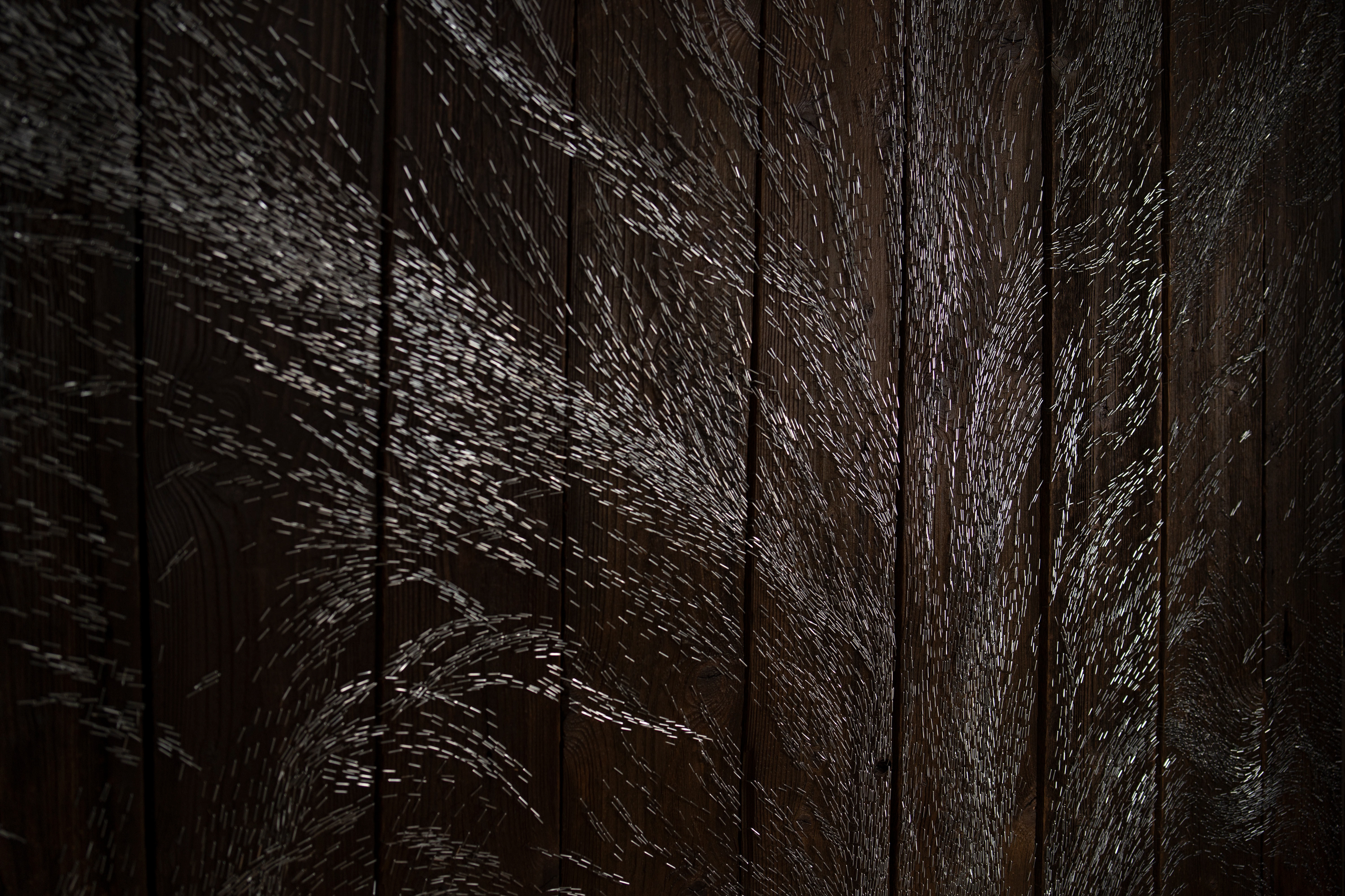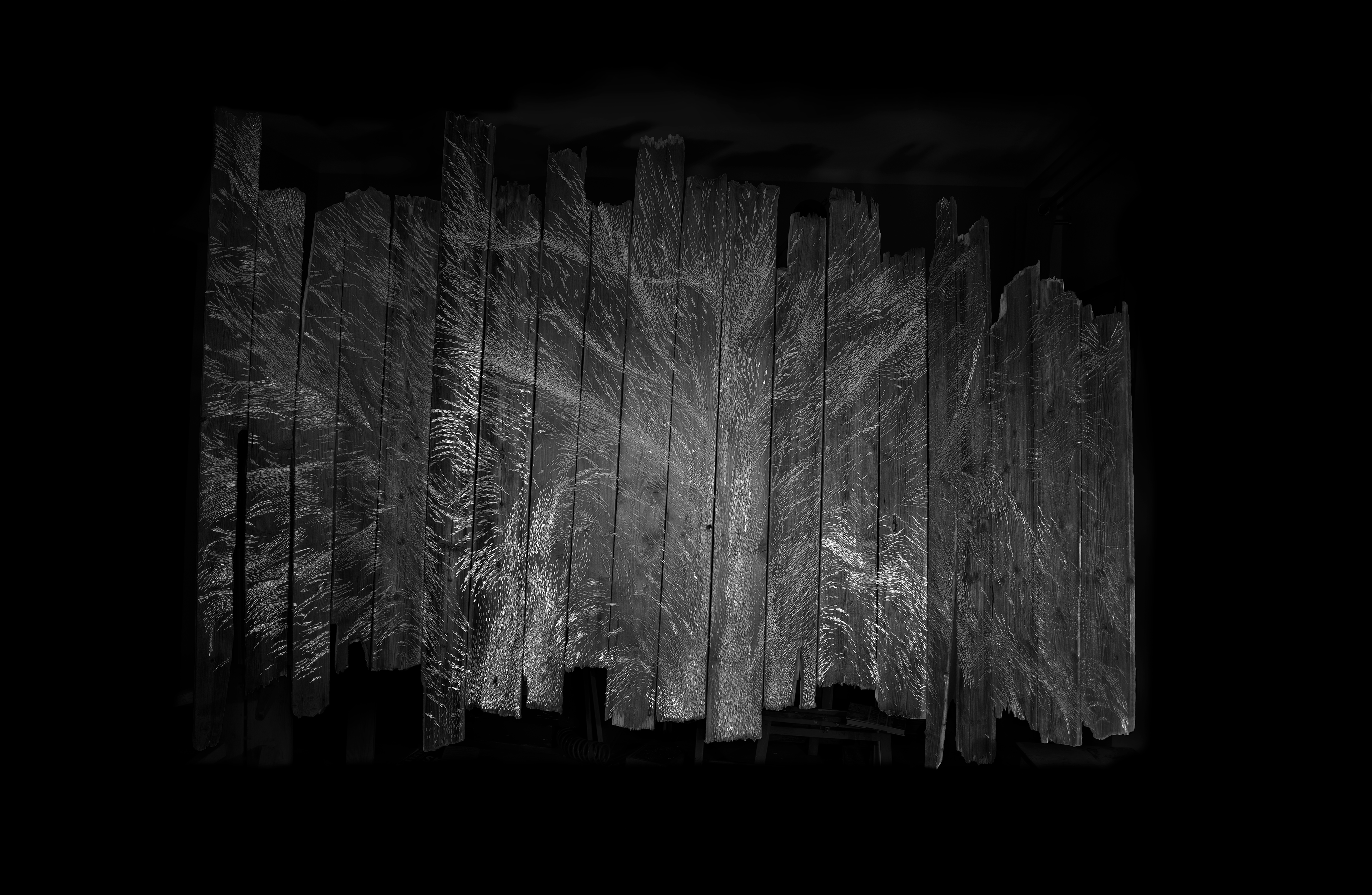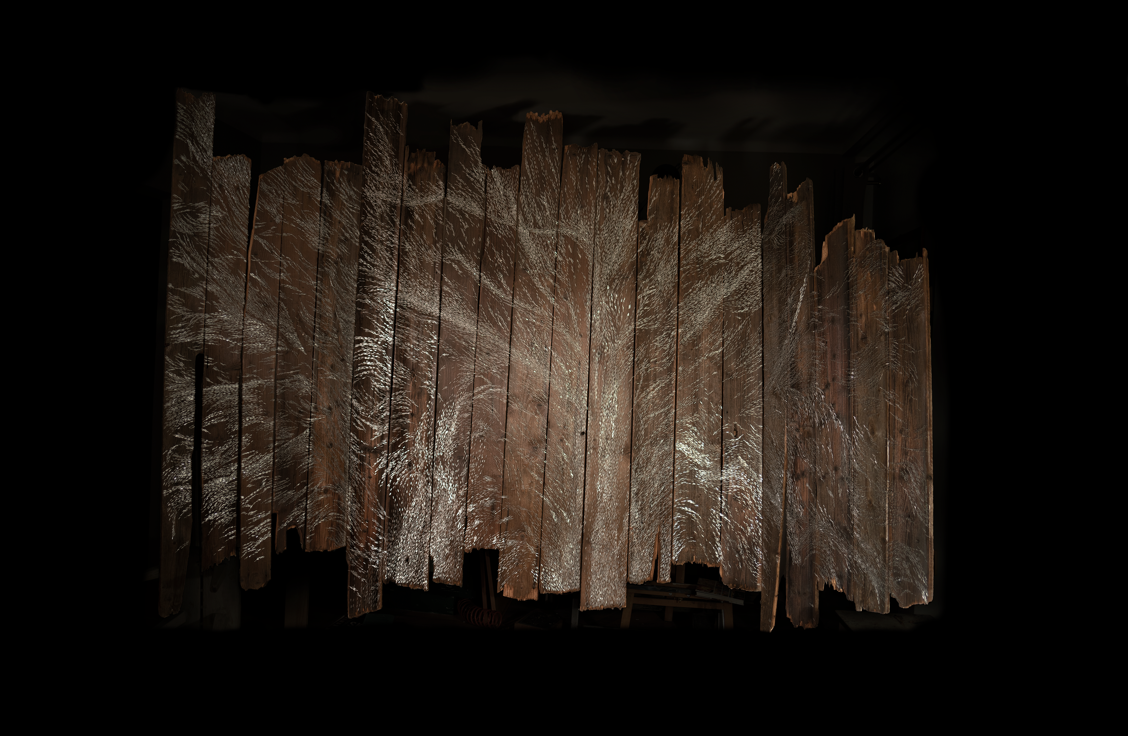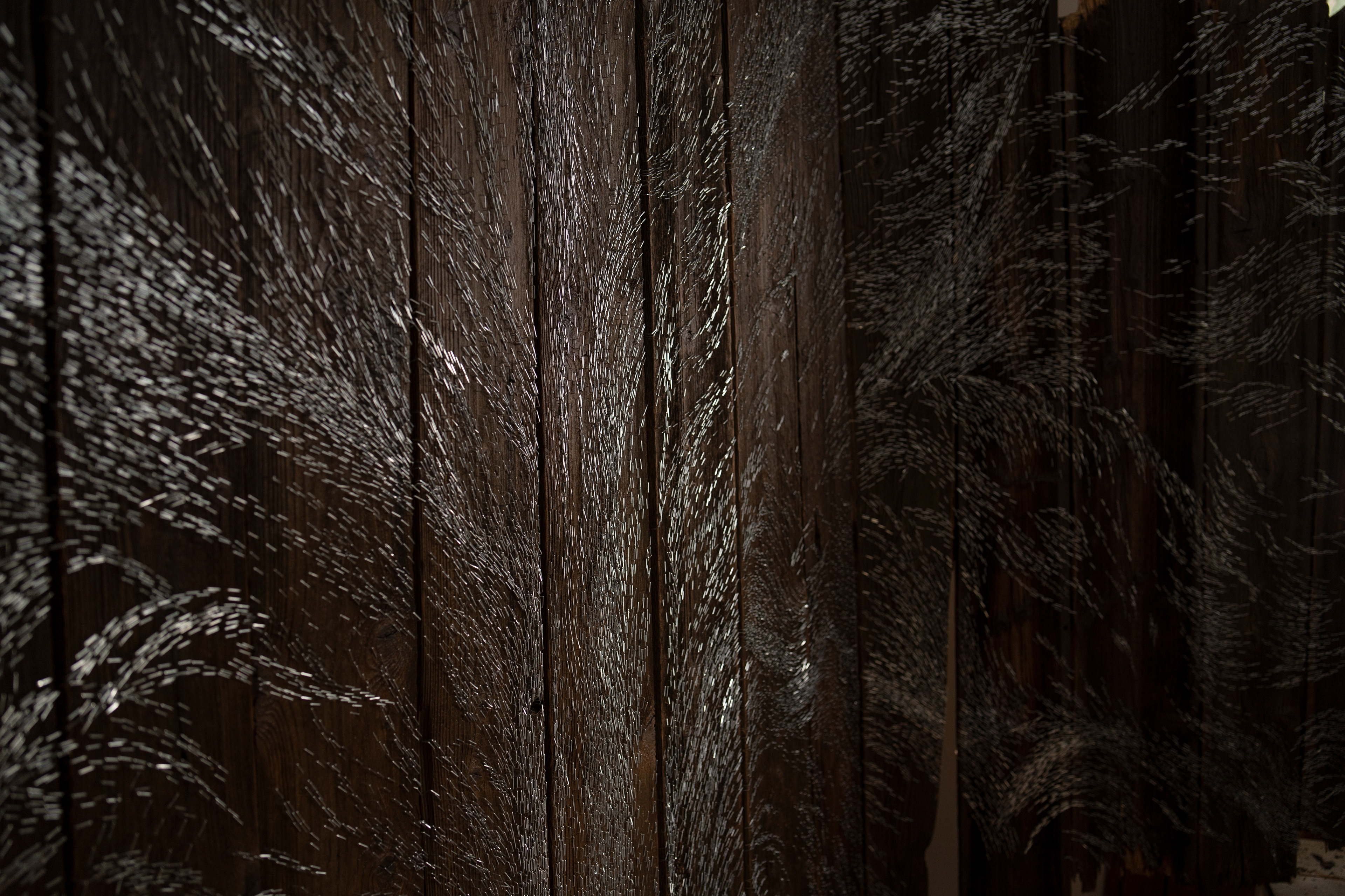 Pain and Glory, triptych, 255 × 370 × 70 cm, staples on wood, 2025/2026